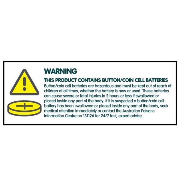 - If it is suspected a button/coin cell battery has been swallowed or placed inside any part of the body, seek medical attention immediately or contact the Australian Poisons Information Centre on 131126 for 24/7 fast, expert advice. These batteries can cause severe or fatal injuries in 2 hours or less if swallowed or placed inside any part of the body.