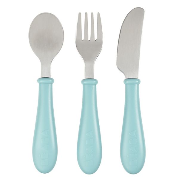 BEABA Stainless Steel Cutlery 3-piece set: spoon, fork and spreader knife to help kids learn to use real utensils.