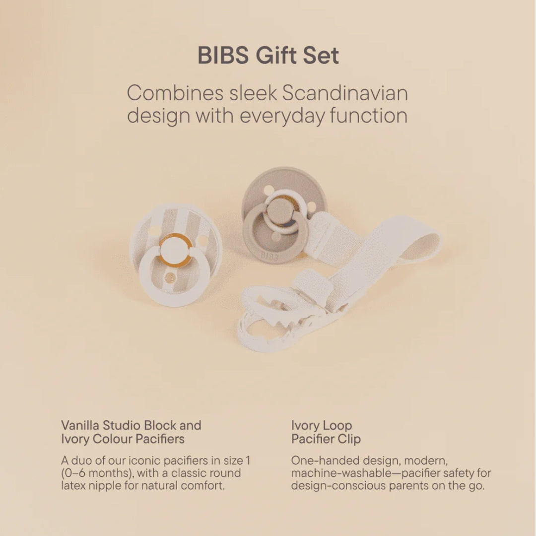 BIBS Gift Set is a sweet product bundle consisting of two BIBS Studio Collection Latex Pacifiers & Loop Clip. The perfect product combination for newborns, and ideal as a gift for baby showers, as a maternity gift, or for new or expecting parents who want the absolute best for their little one.