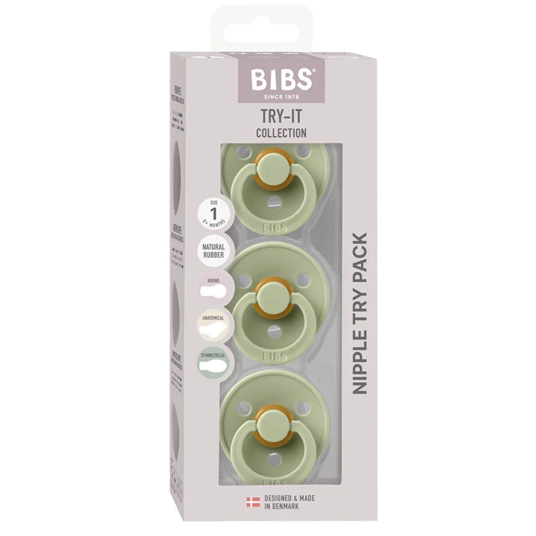 Welcome to the BIBS Try-it-Collection. In the collection, you will have a pacifier with a selection of all BIBS nipple types (Round, Symmetrically and Anatomically).