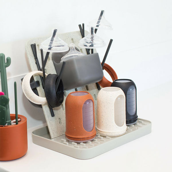 GET INTO THE GROOVE. Countertop clutter getting you down? Boon’s GROOVE Drying Rack gives you extra room without taking up extra space. It can hold up to 6 baby bottles or other mealtime items and features modular pieces that let you customize your dry. The large caddy is great for toddler plates, while the small caddy is perfect for utensils and pacifiers. The bottle trees do double duty for sippy cups and other items. And with two sides and the base of GROOVE to use, there’s plenty of space to set it up the way that works best for you. Company coming? GROOVE packs flat for easy storage when not in use.
