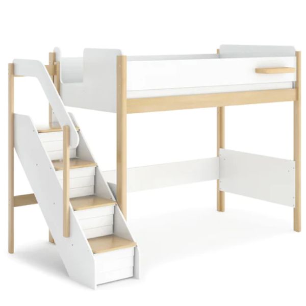 The Natty King Single Loft Bed features a contemporary two-tone design. It's ideal for Scandinavian-inspired interiors and includes a handy little shelf to keep items close by, as well as a storage staircase complete with plastic storage tubs perfect for keeping your child's bedroom neat and tidy.