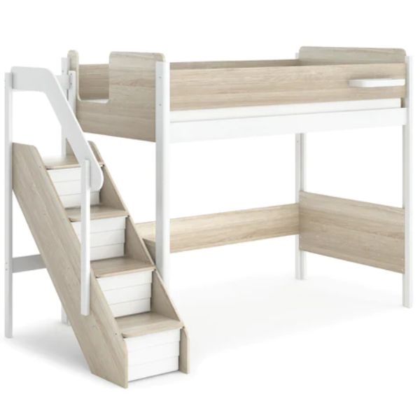 The Natty King Single Loft Bed features a contemporary two-tone design. It's ideal for Scandinavian-inspired interiors and includes a handy little shelf to keep items close by, as well as a storage staircase complete with plastic storage tubs perfect for keeping your child's bedroom neat and tidy.