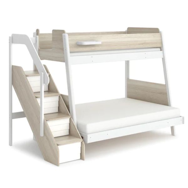 The Natty Maxi Bunk Bed with Storage Staircase is a space-saving triple sleeper bunk bed with a modern two-tone design. The top bunk is a standard single bed size and the bottom bunk is a standard double bed, making it ideal for older siblings and sleepovers.