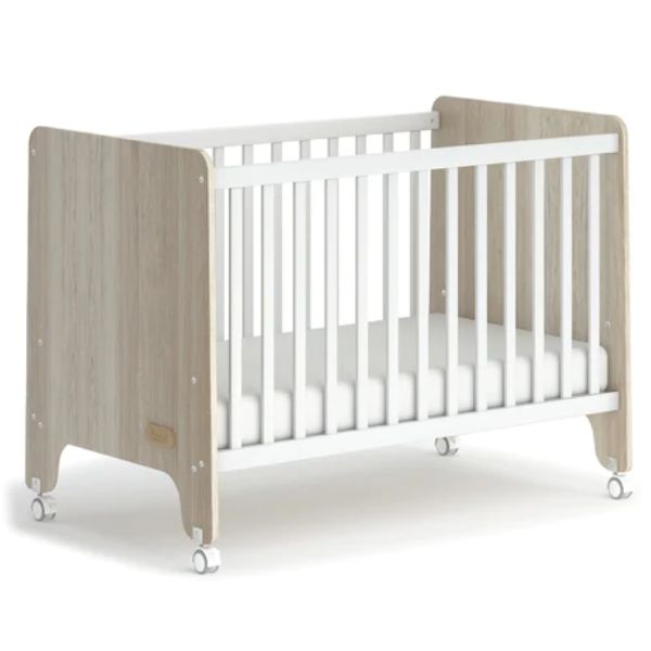 The Natty Compact Cot features a playful design with closed end panels, and wheeled feet, reminiscent of a figure on roller skates!