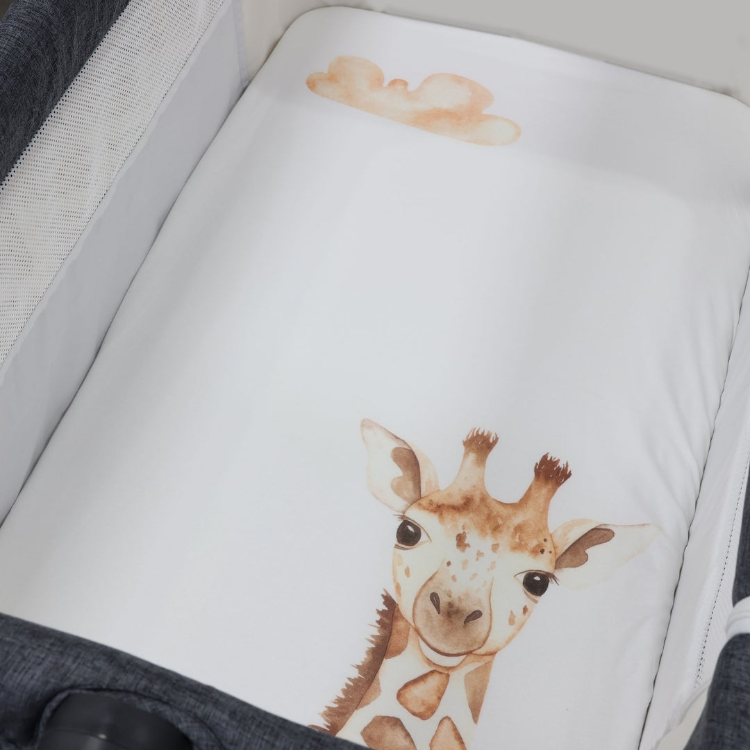 Each piece in the collection is designed to inspire curiosity and creativity, featuring a giraffe character surrounded by lush greens to promote a soothing atmosphere. These gorgeous fitted sheets designed by Bubba Blue are made from soft jersey for comfort and feature elasticized edges for a snug fit.