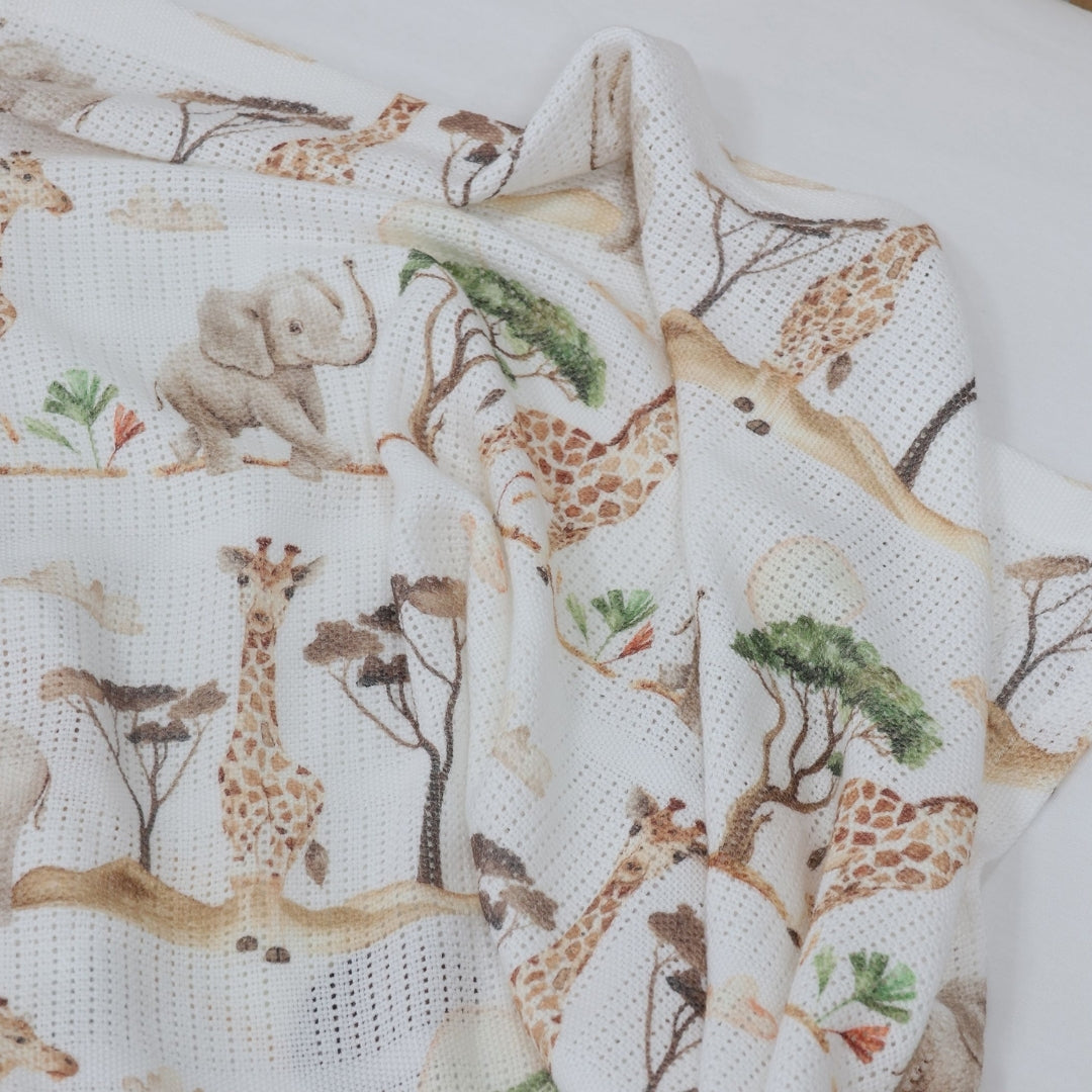 This gorgeous soft & comfortable, airflow, classic cellular blanket designed by Bubba Blue is the perfect blanket for all year round. It features a sweet all over print. Crafted in a classic airflow cellular weave, it allows excess heat to escape in summer, whilst keeping the baby comfortable in winter.