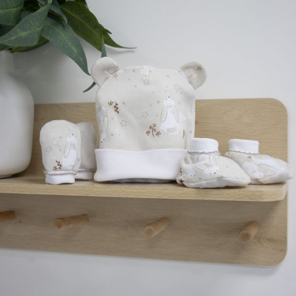 This gorgeous 3 pieces newborn set includes a beanie with novelty ears, a pair of booties, and a pair of mittens (anti-scratch).