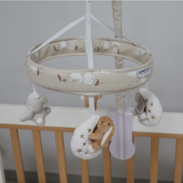 With a wind up mechanism, this Musical Mobile from the Bubba Blue 'Bunny Dreams' Collection features cute white & beige bunnies in the night sky hugging the moon. It's sure to entertain and slowly drift baby into a dreamy and relaxing sleep.