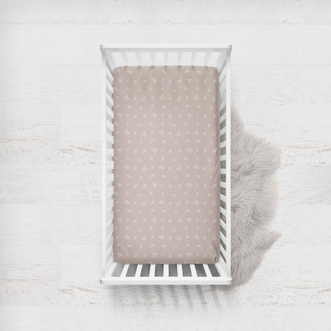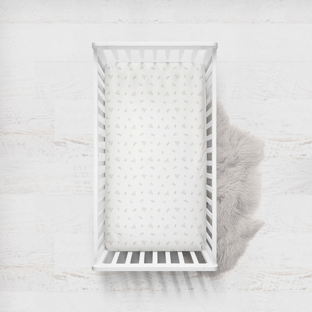 - Pack of 2 fully fitted cot size sheets in sweet small-scale floral design in chestnut and natural white