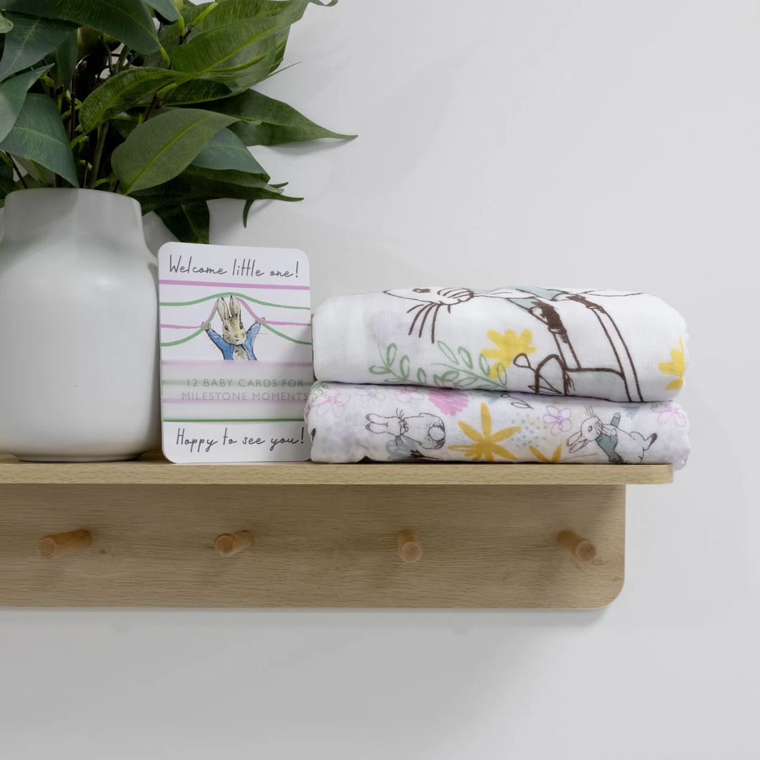 From the classic Beatrix Potter books comes this sweet and adorable collection. Peter Rabbit has a heart-warming effect on anyone who lays eyes on this lovable character. The adventures of Peter Rabbit and his friends, inspired by Beatrix Potters love of nature, continue to delight generations of children around the world. Good night to all little bunnies everywhere! Each set includes 2 large, super soft muslin swaddles and 12 adorable cards to capture and celebrate the exciting development milestones in your babys 1st year. So many possibilities for you and your baby to enjoy.