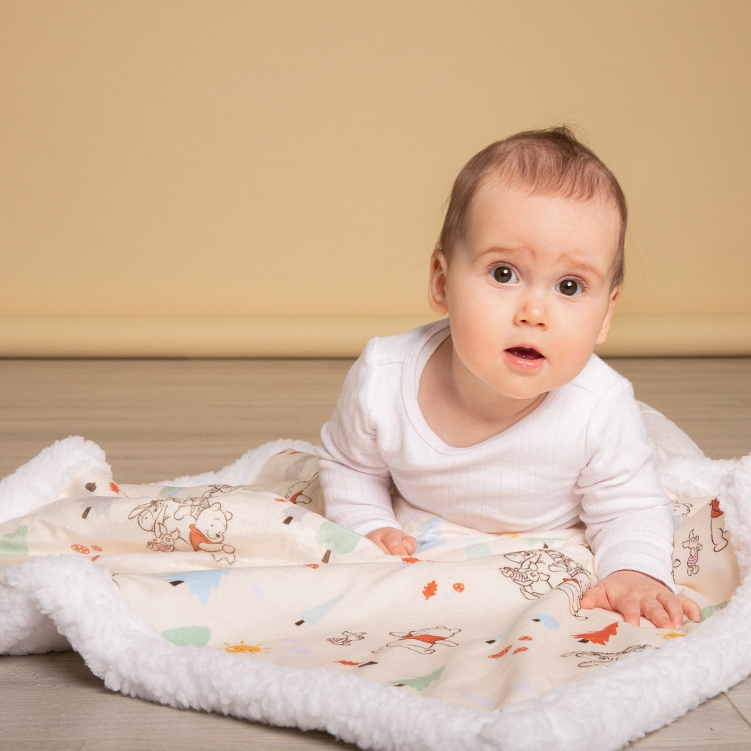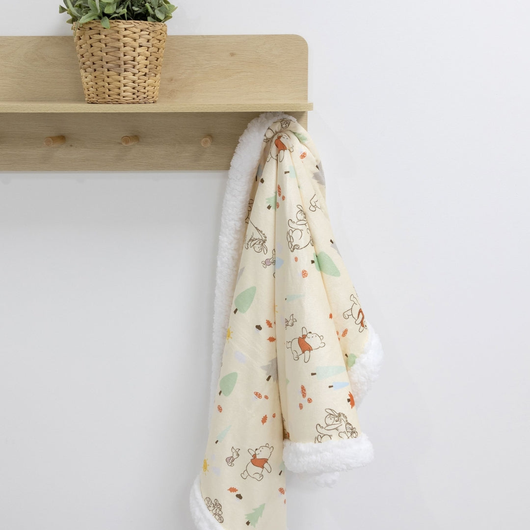 Luxuriously cuddly reversible blanket with soft white fleece lining, featuring adorable Winnie the Pooh and his friends back in 100 Acre Wood, happily walking through the leafy outdoors, discovering what grows around them. Prints and patterns depict the characters at one with nature, discovering all of the beautiful forest foliage.