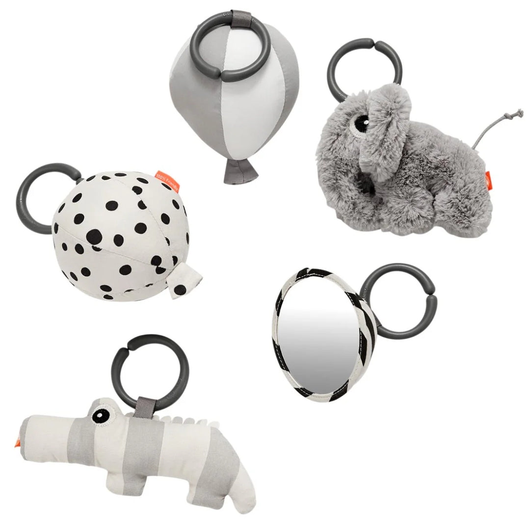 - The toy link or ring on each character allows you to secure it to the pram or car seat as well