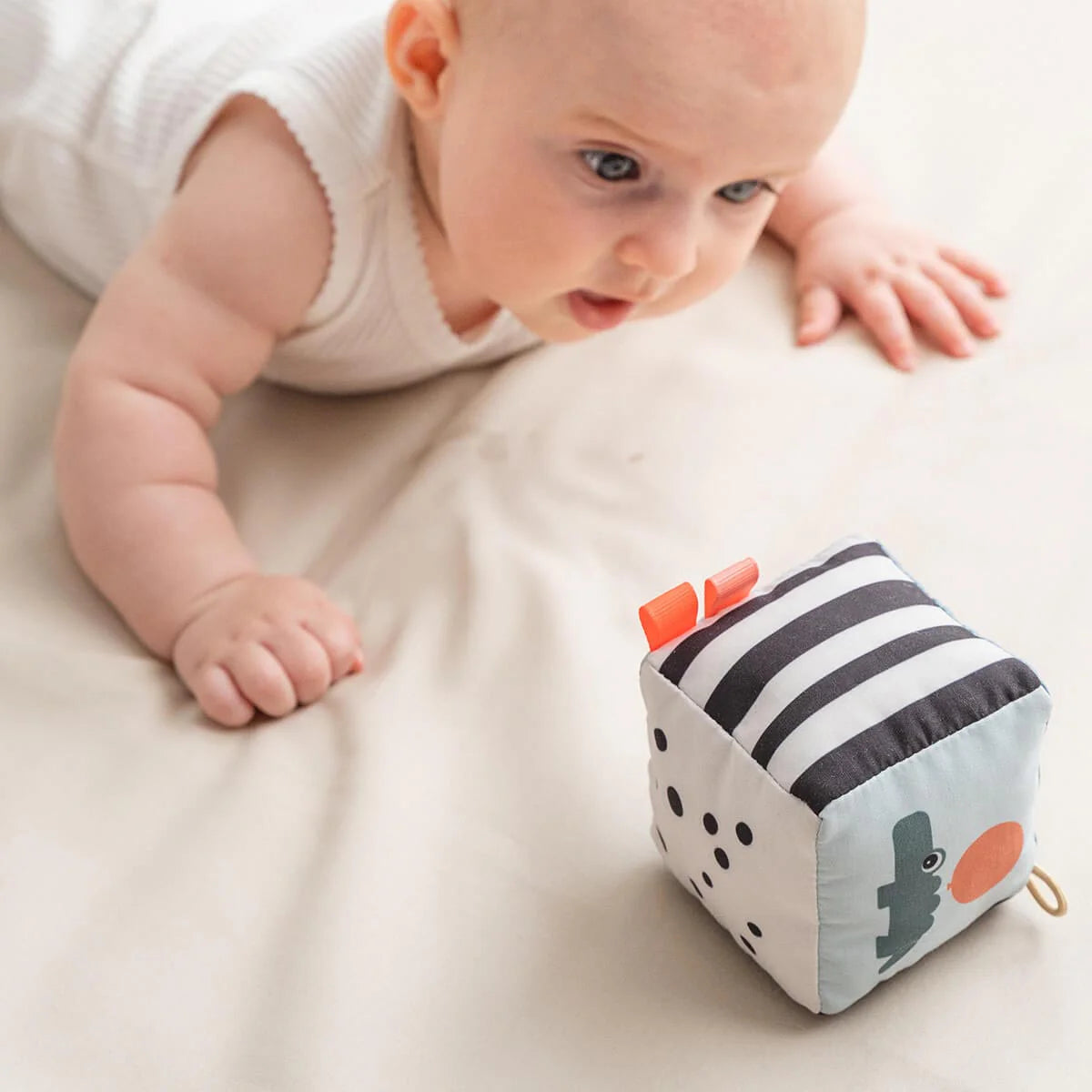 Soft contrasting baby cube with Happy clouds theme, with fun colours and contrasts for visual stimulation. Rattle sound from inside increases baby's curiosity. A great toy for tummy time. Toy link not included.