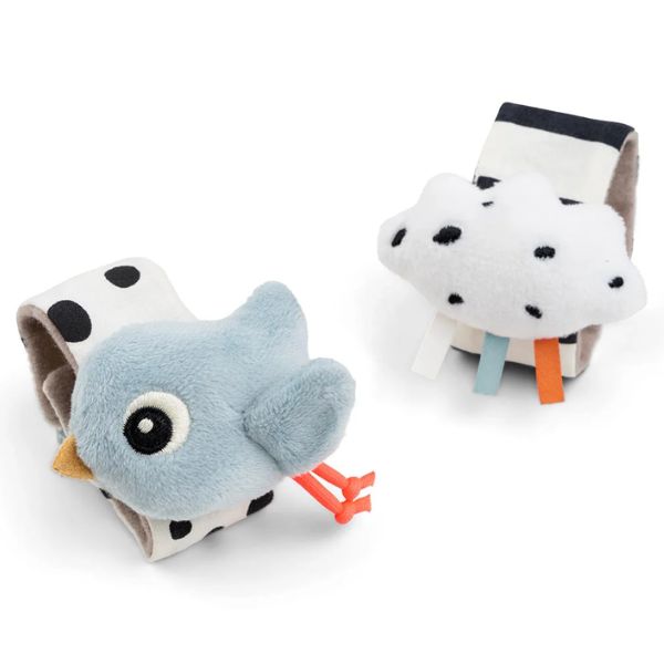 Happy clouds wrist rattle set consists of 2 soft baby bracelets with powder details. For use from 0 months, it's an ideal toy for sensory stimulation, body awareness, and hand recognition.