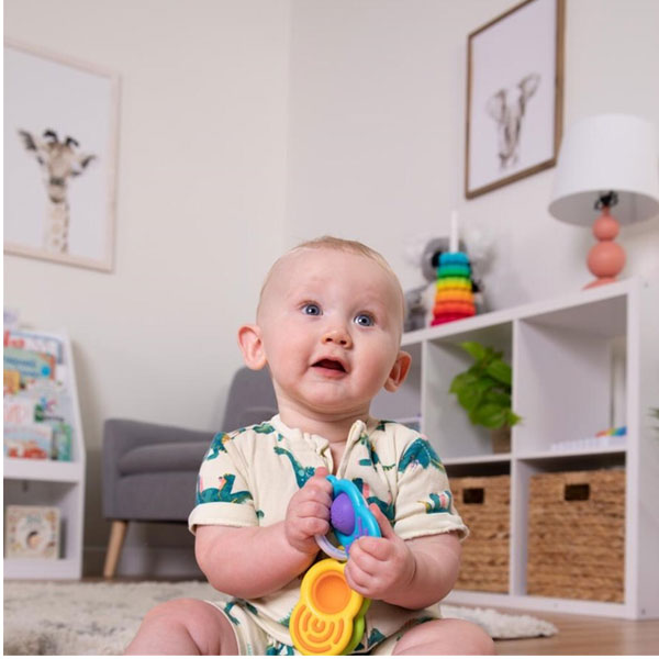 Three unique sensory experiences ready to clip and go anywhere! Each Clutch features a dimpl bubble on one end and squishy silicone textures on the other. There's green with bumps, yellow with circles, blue with lines... so much for the fingers to explore! Perfectly chunky and click-clacking on a big clip-n-go ring, Dimpl Clutch is a must-have for all your adventures.
