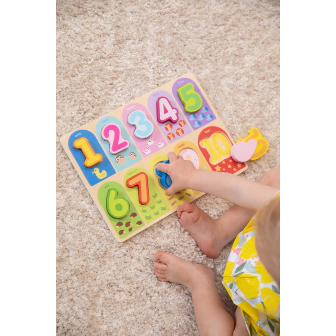 Early tactile skills are challenged as little learners match each of the 10 wooden numbers with their slots in the puzzle board. Meanwhile, vibrant illustrations encourage early counting...