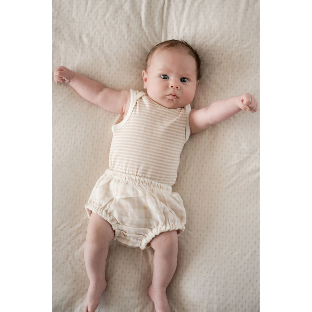 This Jersey Striped Sleeveless Body Suit is cozy, breathable, and made of chemical-free Organic Natural Colour Cotton. With contrasting neck and sleeve binding, an enveloped neck line, and dome snaps for quick and easy nappy access, this suit is designed to be comfortable and hypoallergenic for your baby.