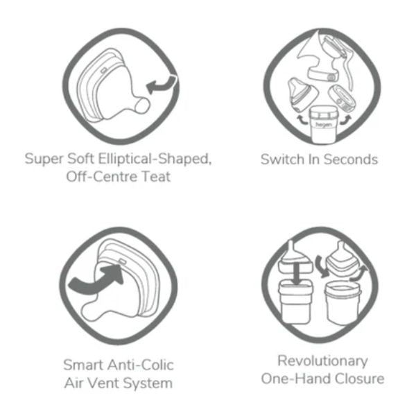 Additional teats of various sizes (all sold separately) allow mothers to simply swap to their choice of teats for baby’s perfect feed as time goes by.