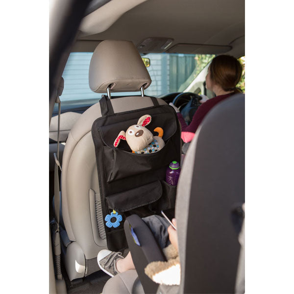 Featuring mesh and velcro pockets, which make for easy storage of toys and drink bottles for your little ones to access while in the car. In addition, it protects the backs of your vehicle seats from being damaged by dirty feet and shoes. The simple hook attachments also make it easy to use with most vehicle seats.