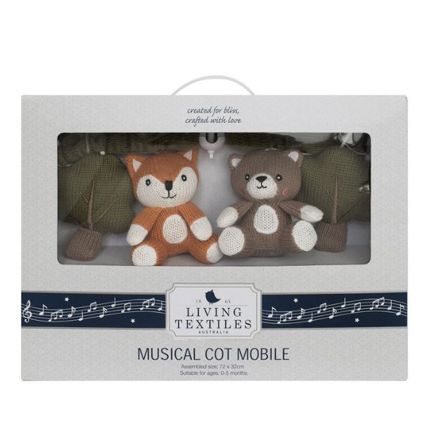 Little ones are going to love watching these sweet forest characters rotate overhead to Brahms lullaby as they drift off to sleep. This gorgeous musical cot mobile features 100% cotton knit characters with exquisite detailing and is the perfect finishing touch to your nursery.