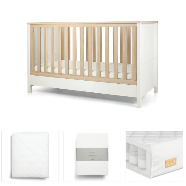 Mamas & Papas Harwell White/Natural 4 piece set with Cot Bed, Mattress, Fitted Sheets & Mattress Protector