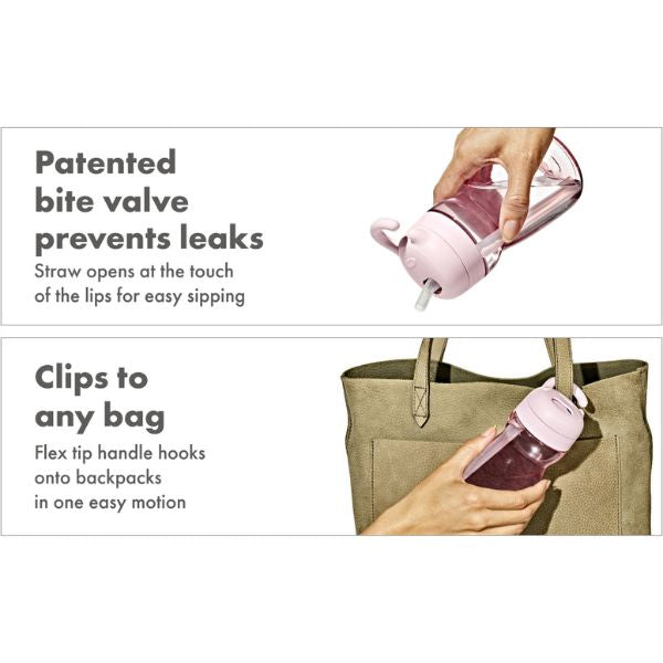 Keeping active tots hydrated is important and the OXO Tot Adventure Bottle is designed to do just that—and with less mess. With the OXO Tot Adventure Water Bottle, you can let kids sip without worrying about making a mess. This 12-oz water bottle features a patented, spill-proof straw that helps put an end to leaks, drips, and dribbles. The bite valve opens the moment your child's lips touch the straw, so it's easy for kids who want to do everything on their own. Tots can open the straw lid with a twist, while grown-ups will have no trouble separating the two-part hinged cap for a thorough cleaning. The bottle's hourglass shape fits just right in little hands, so kids can carry it anywhere. The flex-tip hook attaches securely to diaper bags, backpacks and more, so it's a snap to bring this bottle with you on all your adventures.