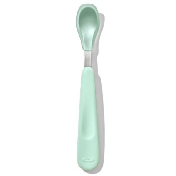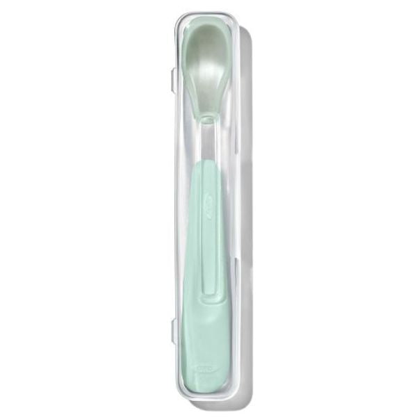 Food-grade silicone coating gives this Feeding Spoon a soft touch. Each shallow spoonful holds just enough for baby’s mouth, and is soft enough to scrape the last bits out of the bowl or wipe them off of baby’s face. Spoon fits neatly into the compact carrying case.