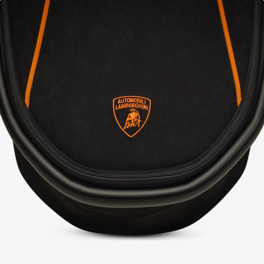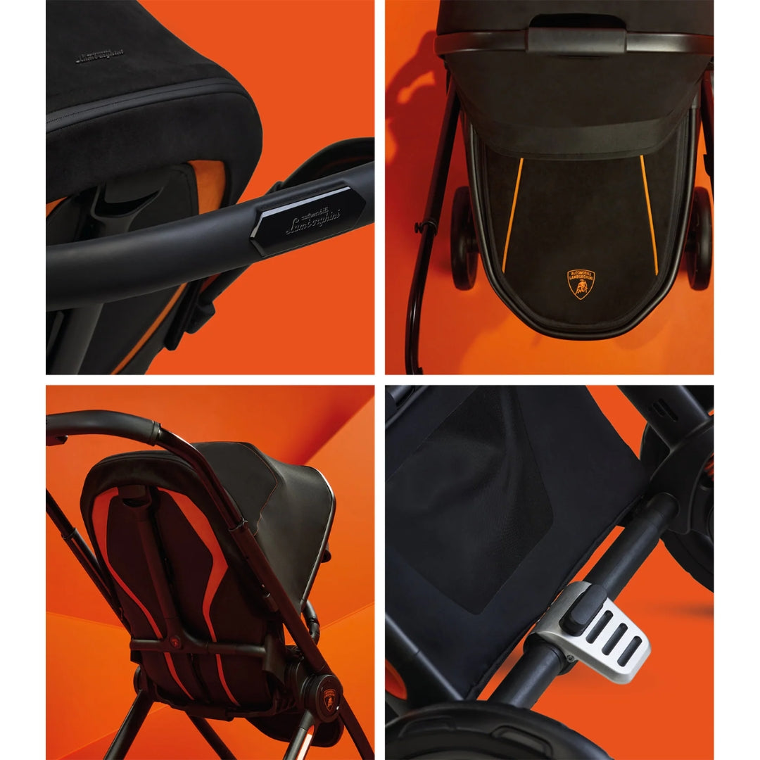 - Automotive-inspired pram seat - Crafted from luxury suede and natural bamboo with ergonomic head support, a multi peak faceted hood and embroidered detailing. Inspired by Automobili Lamborghini vehicle interior