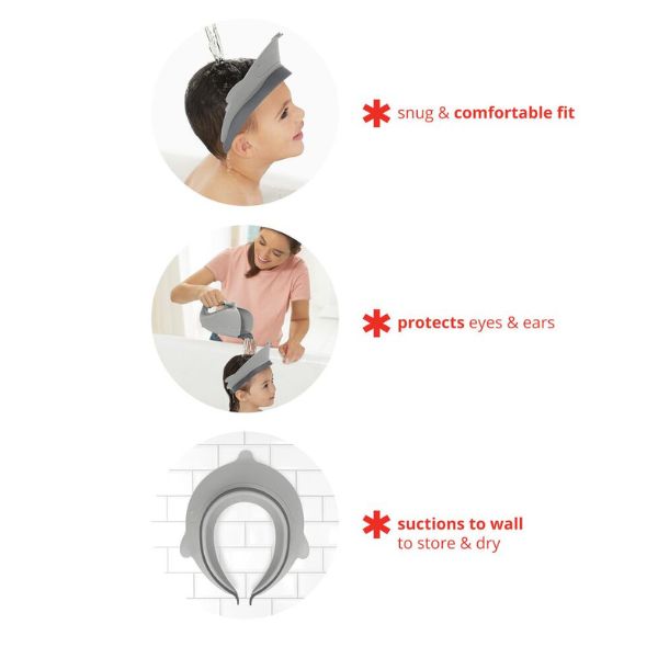 No more tub time tears! Thanks to comfy, flexible material for a custom fit, the cute baby and toddler bath visor creates a snug seal to protect little one's eyes and ears from water and shampoo. An open back makes hair washing easy, while a built-in suction cup lets you hang it on the wall to dry and store.