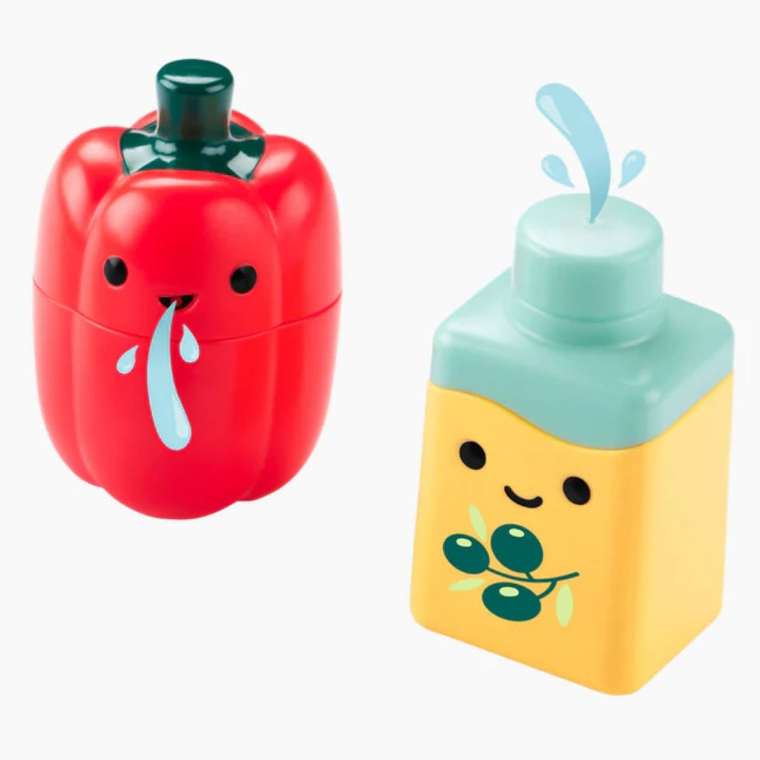 Scoop, strain, squirt, and float! Little chefs can create delish salads – perfect for imaginative play in the bath! Order up some fresh bathtime fun! This 6-piece tub toy set includes all kids need to salad prep in the tub (the pretend play way)! Complete with a strainer bowl, a kale scoop, two cute squirties and more salad-themed fun, treat your little one to extra splashy tub time play.
