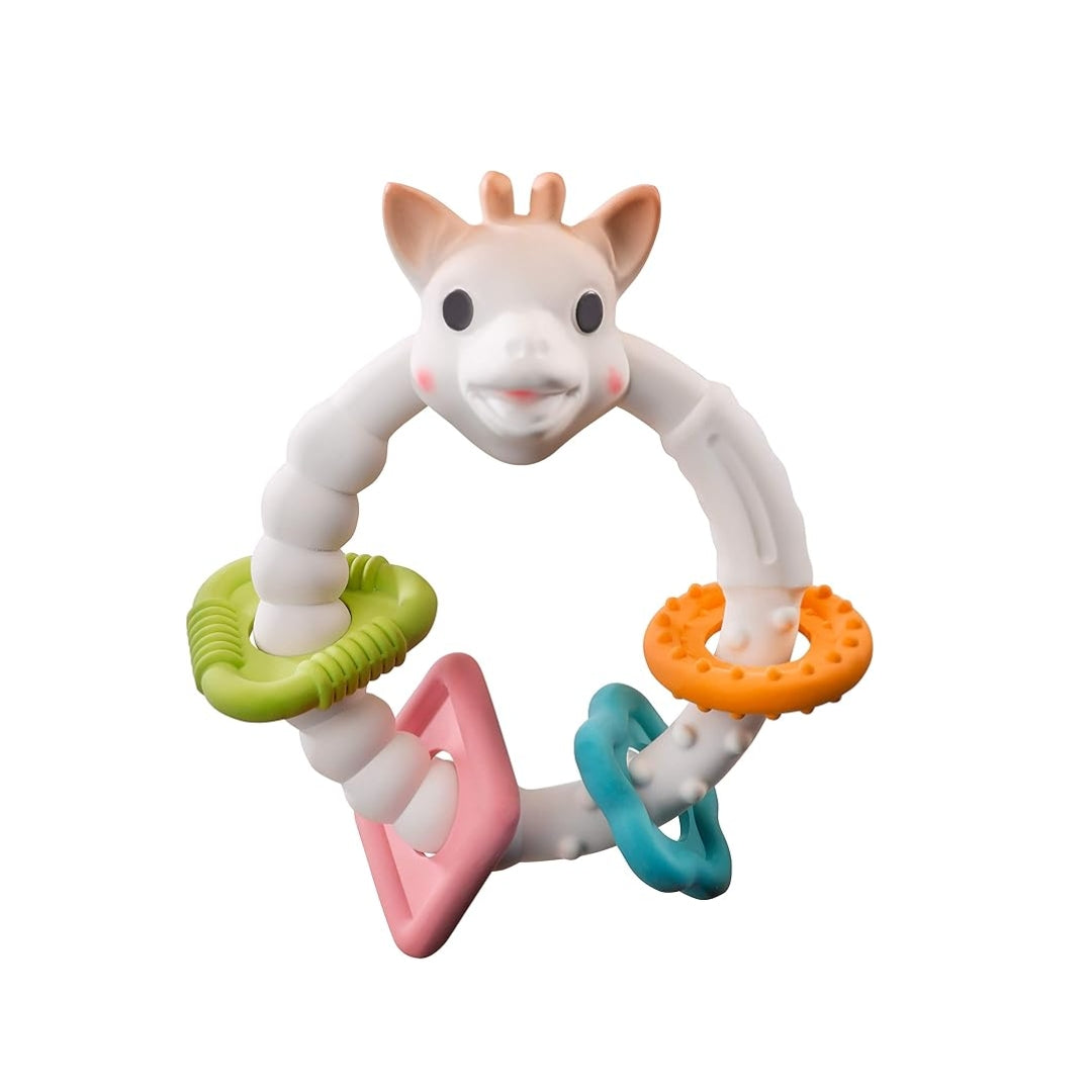 Easy to grab without a cold feeling thanks to its plastic ring in the image of Sophie the Giraffe.