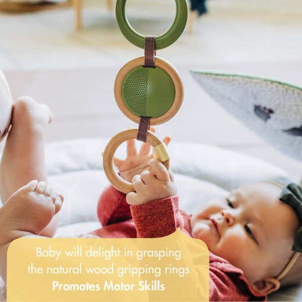- Natural wood grip rings with rattle and sensory ribbons