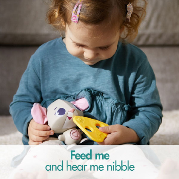 Buddy to bounce or shake them and hear the rewarding wobbling and boing sounds, tickle their tummies to make their hearts glow, press their little noses to make them sneeze, Achoo!.., feed them a carrot, apple or cheese to hear them nibble and put them to bed for sweet, amusing snoring.
