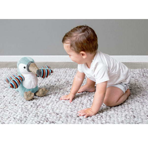 Timo the toucan is a friendly soft toy with clapping hands and sound. Your little one will try to play and sing along with this cute cat. Press Timo's left foot and you will hear the song 'If you are happy and you know it clap your hands'. Press Timo's right foot and she will start playing her interactive clapping game while singing 'clap clap clap your hands, clap your little hands!'.